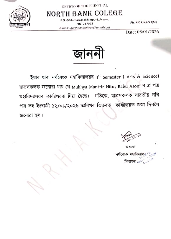 North Bank College, the second oldest institution of higher education in the undivided Lakhimpur District of Assam was established in 1961 in between two rivers, the Brahmaputra and the Subansiri by the entire people of the north bank of the river Brahmaputra. The College was initially affiliated to Gauhati University in 1964 as the co-educational institution but the affiliation was shifted to Dibrugarh University just after its establishment in the year 1965 and brought under the deficit system of Grant-in-aid in the year 1972.