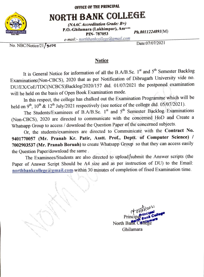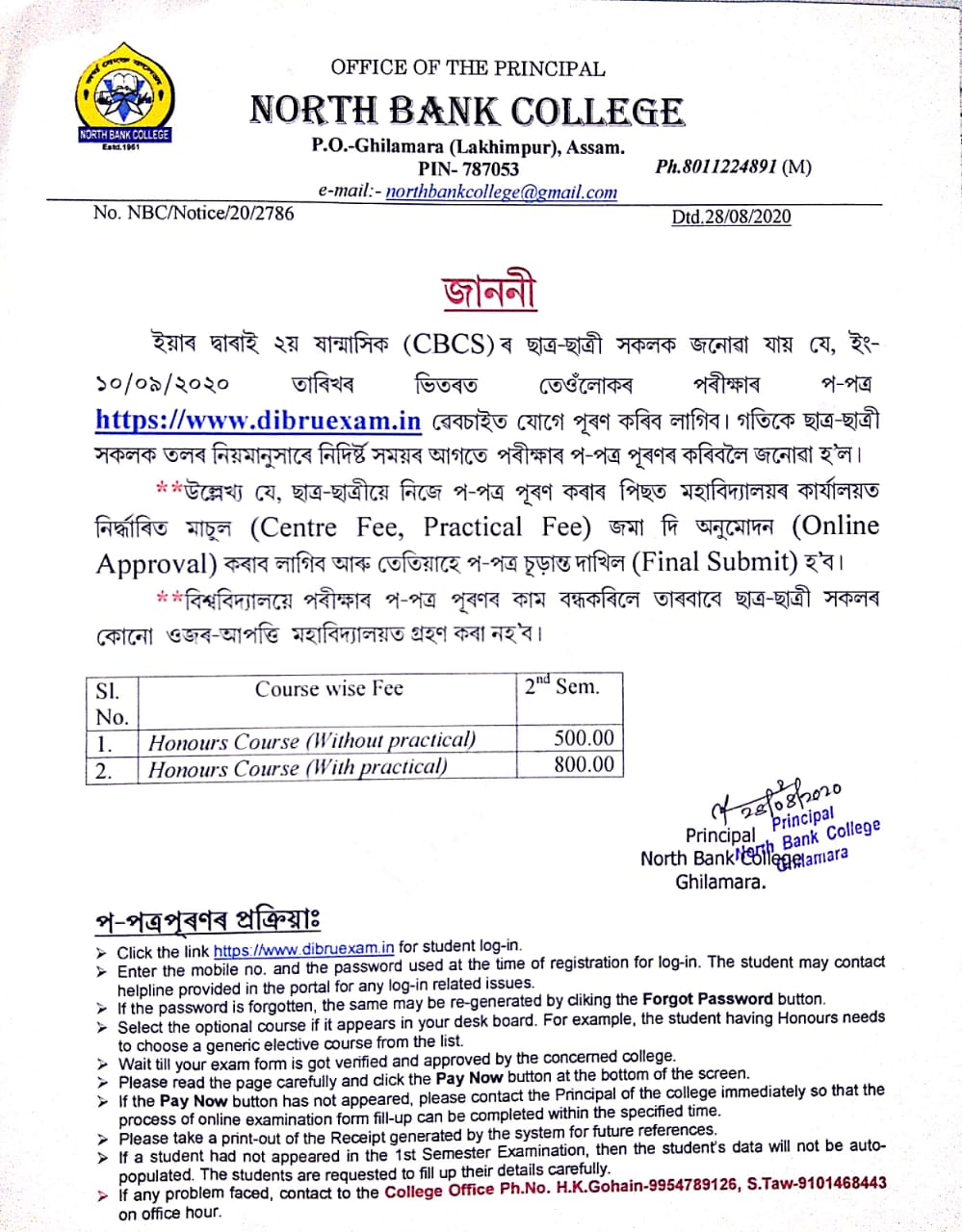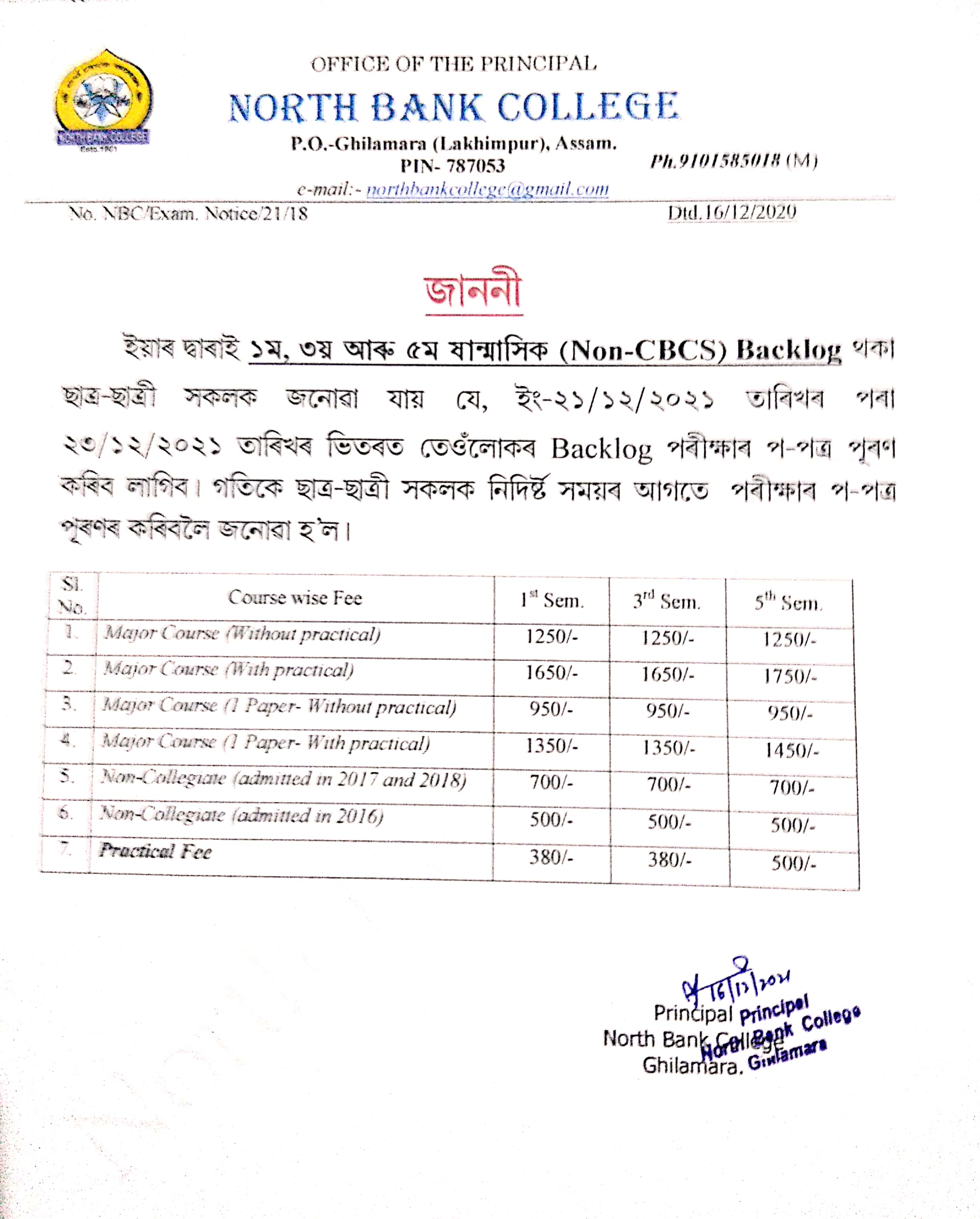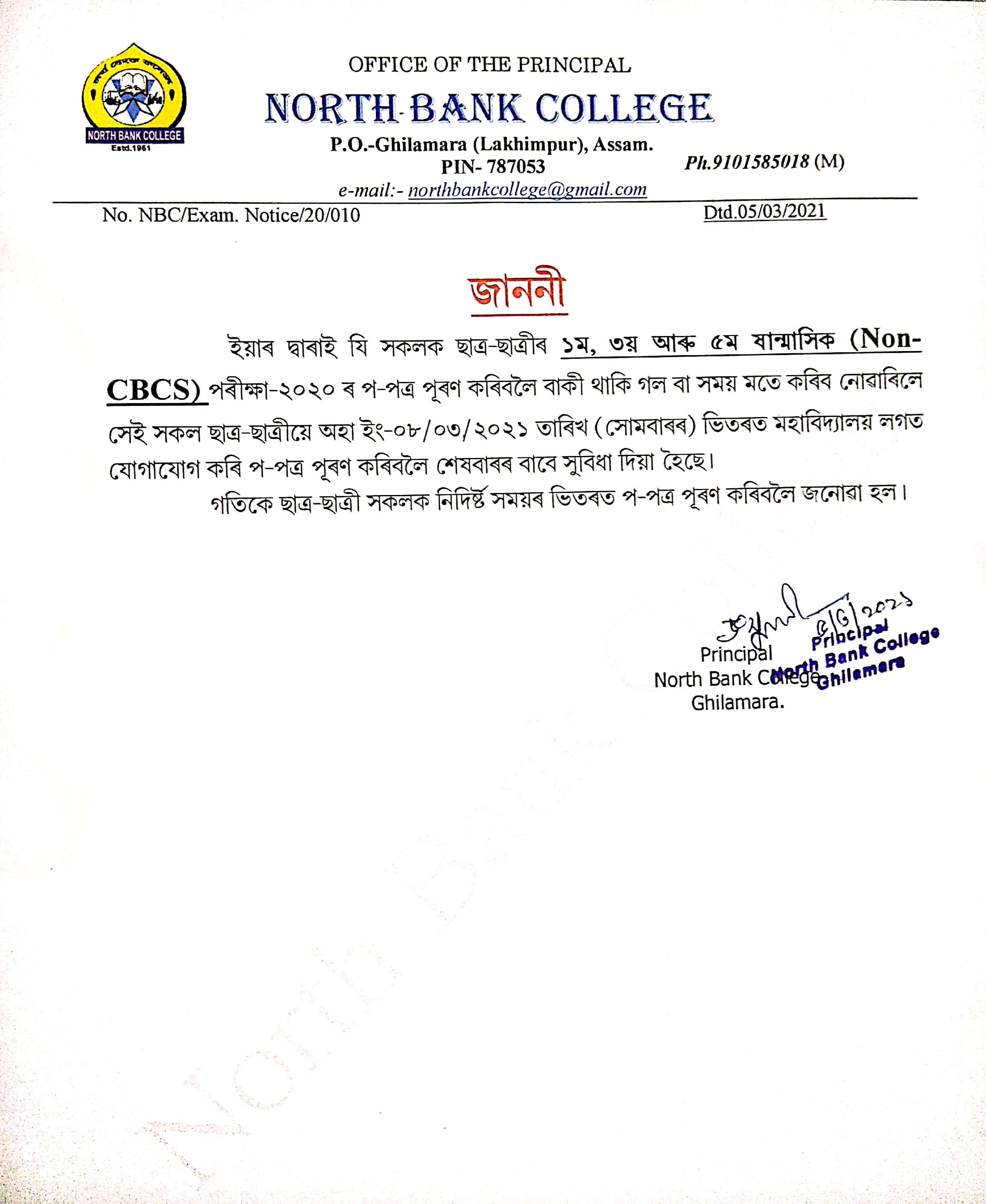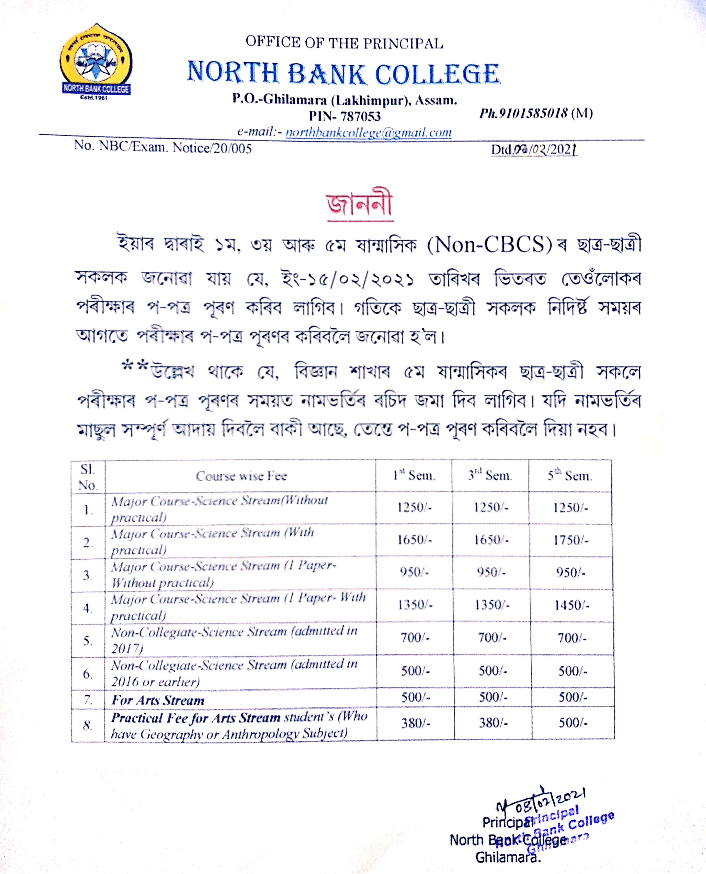 Exam. Form Fillup Notice for 1st, 3rd and 5th Sem (Non CBCS) 2020
