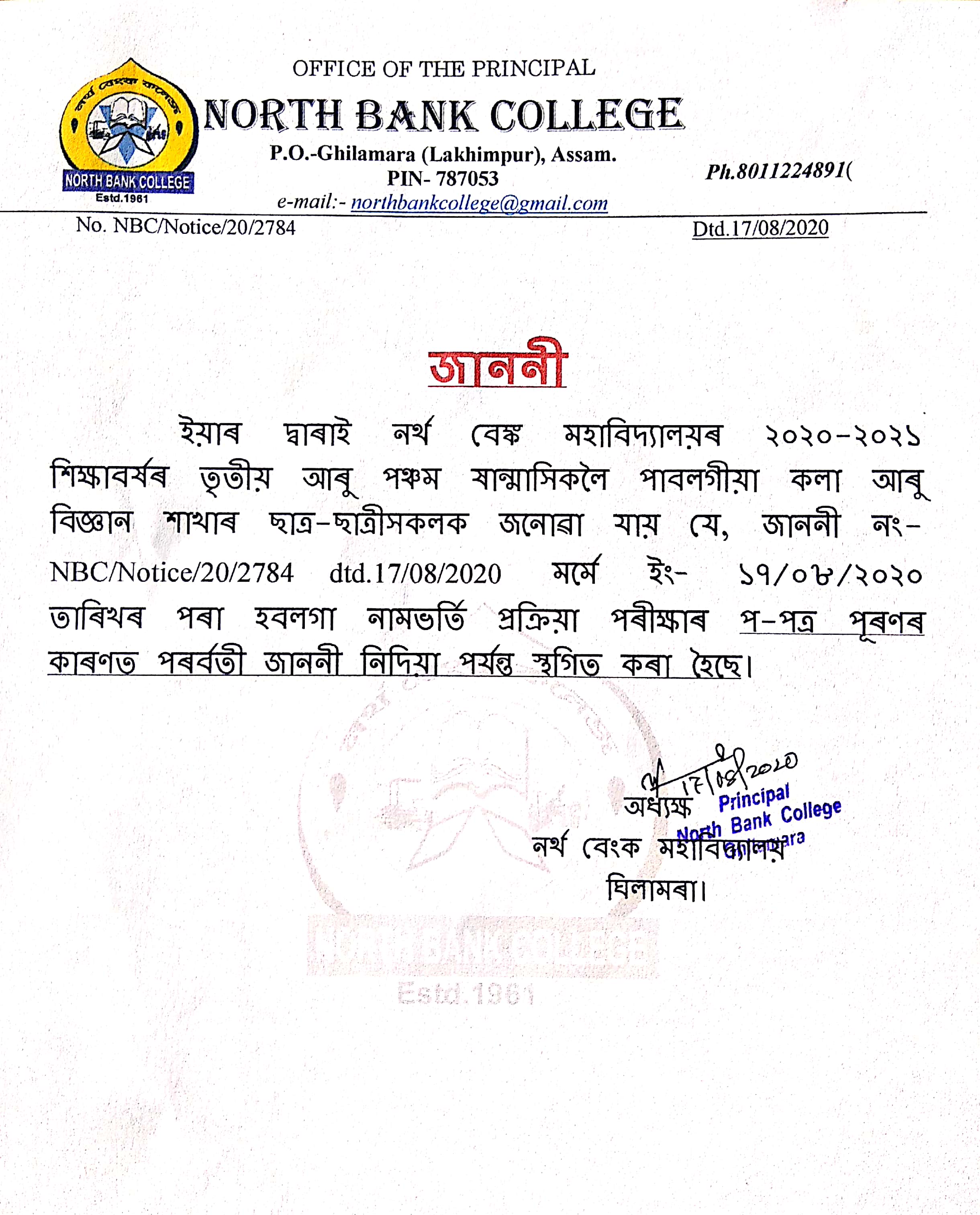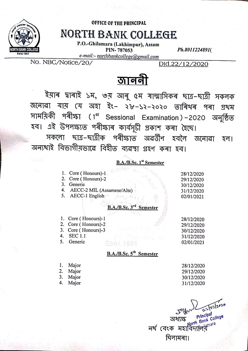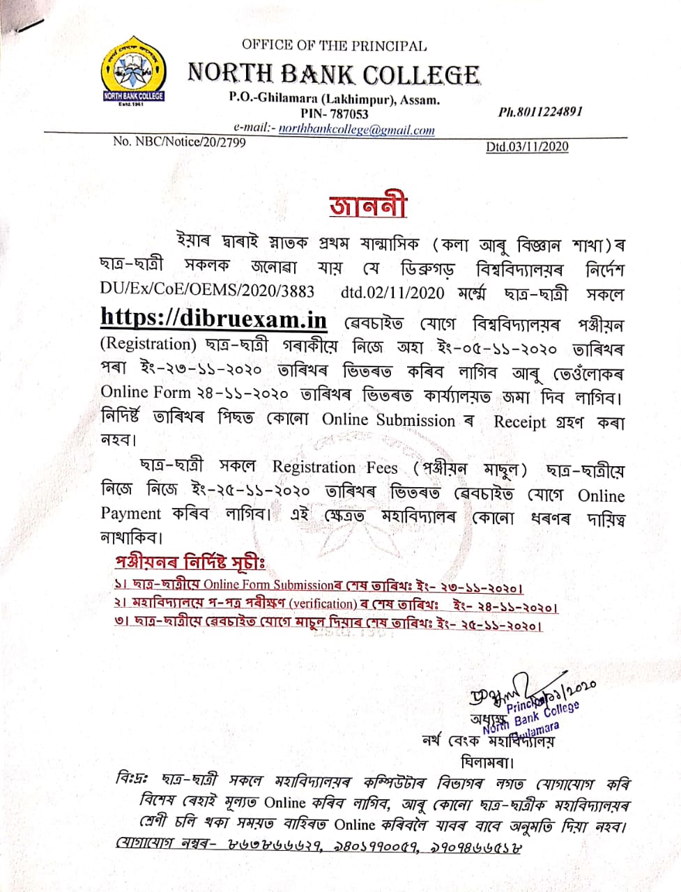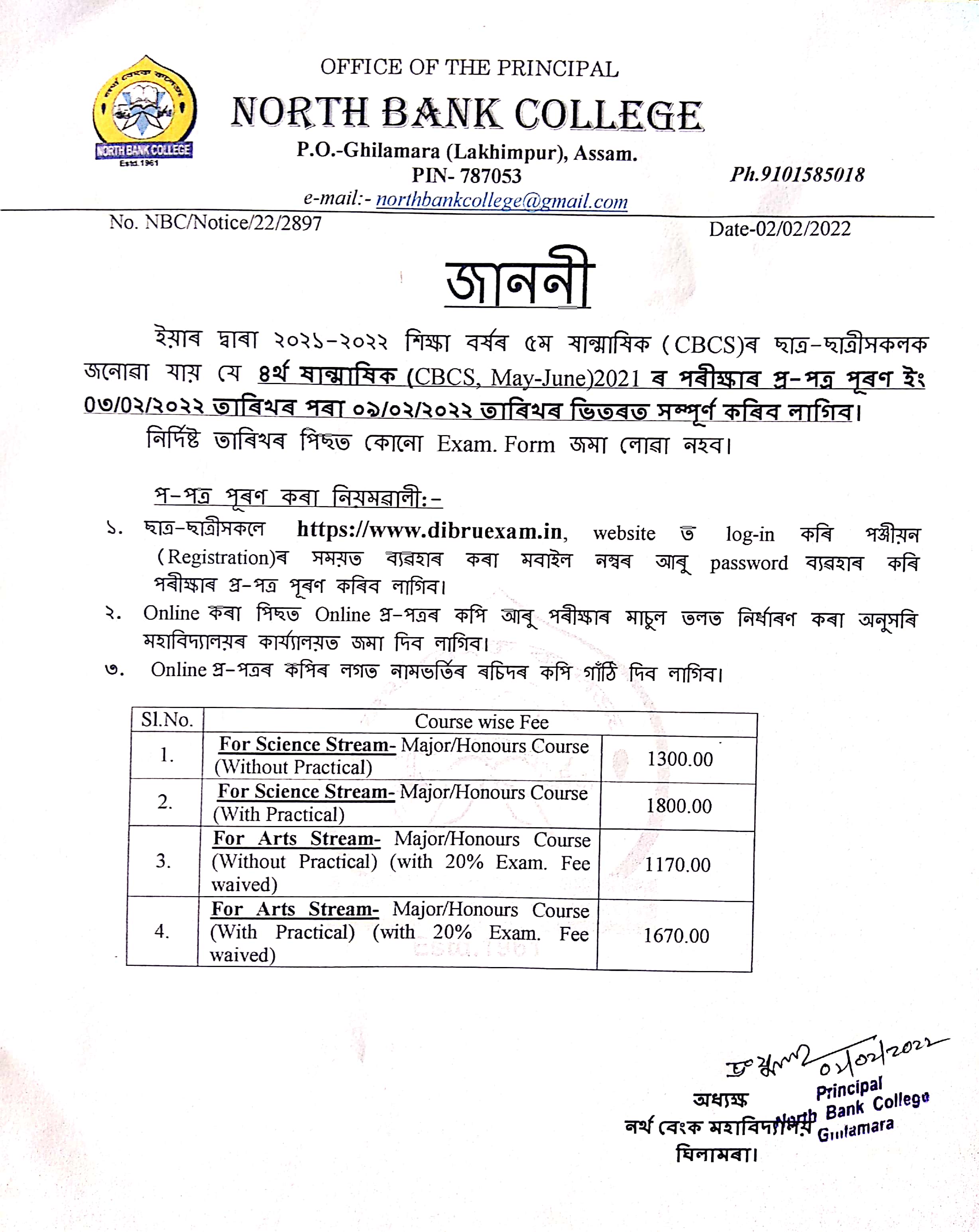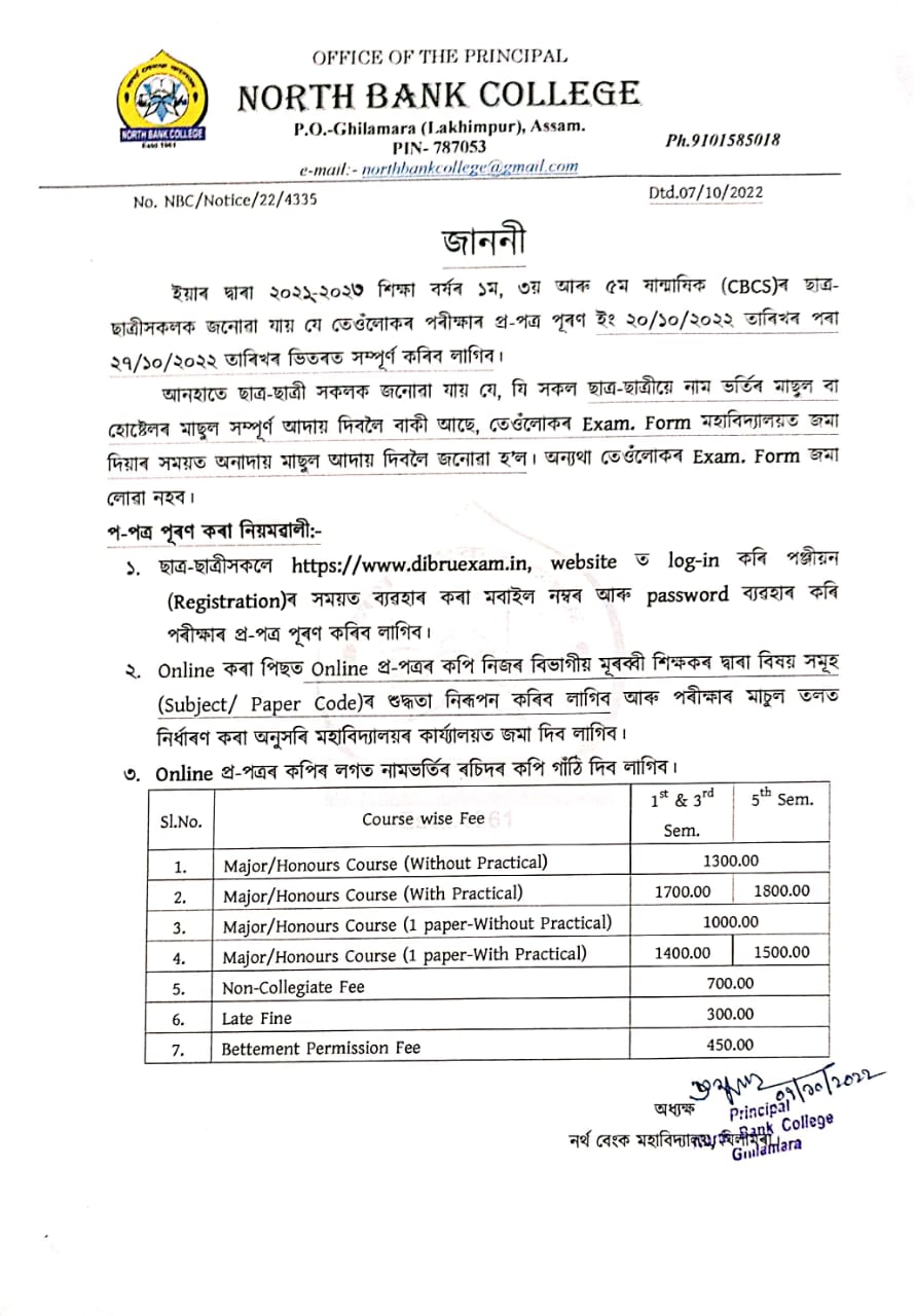 Exam. Form Fillup Notice for 1st, 3rd and 5th Sem (Non CBCS) 2020