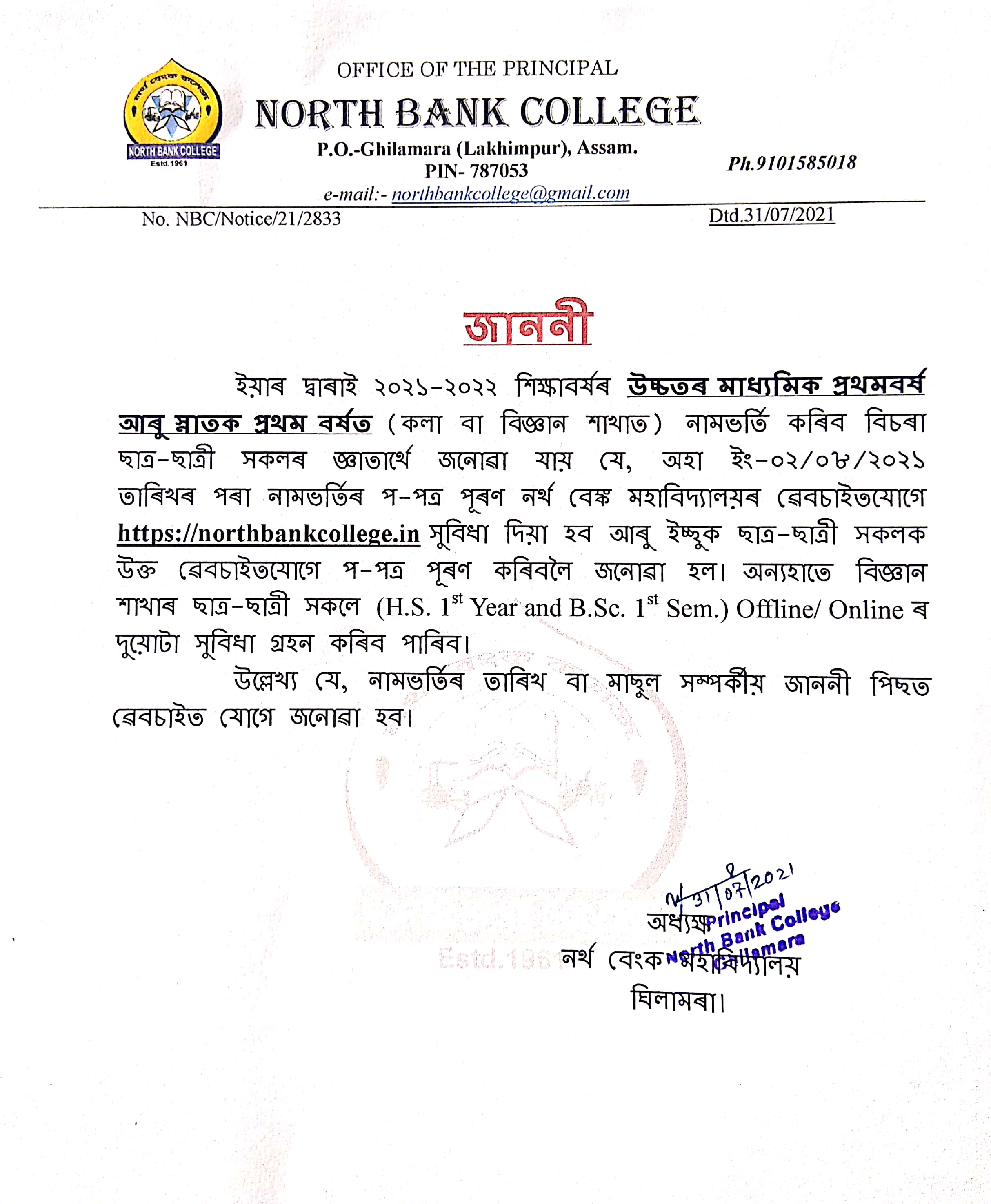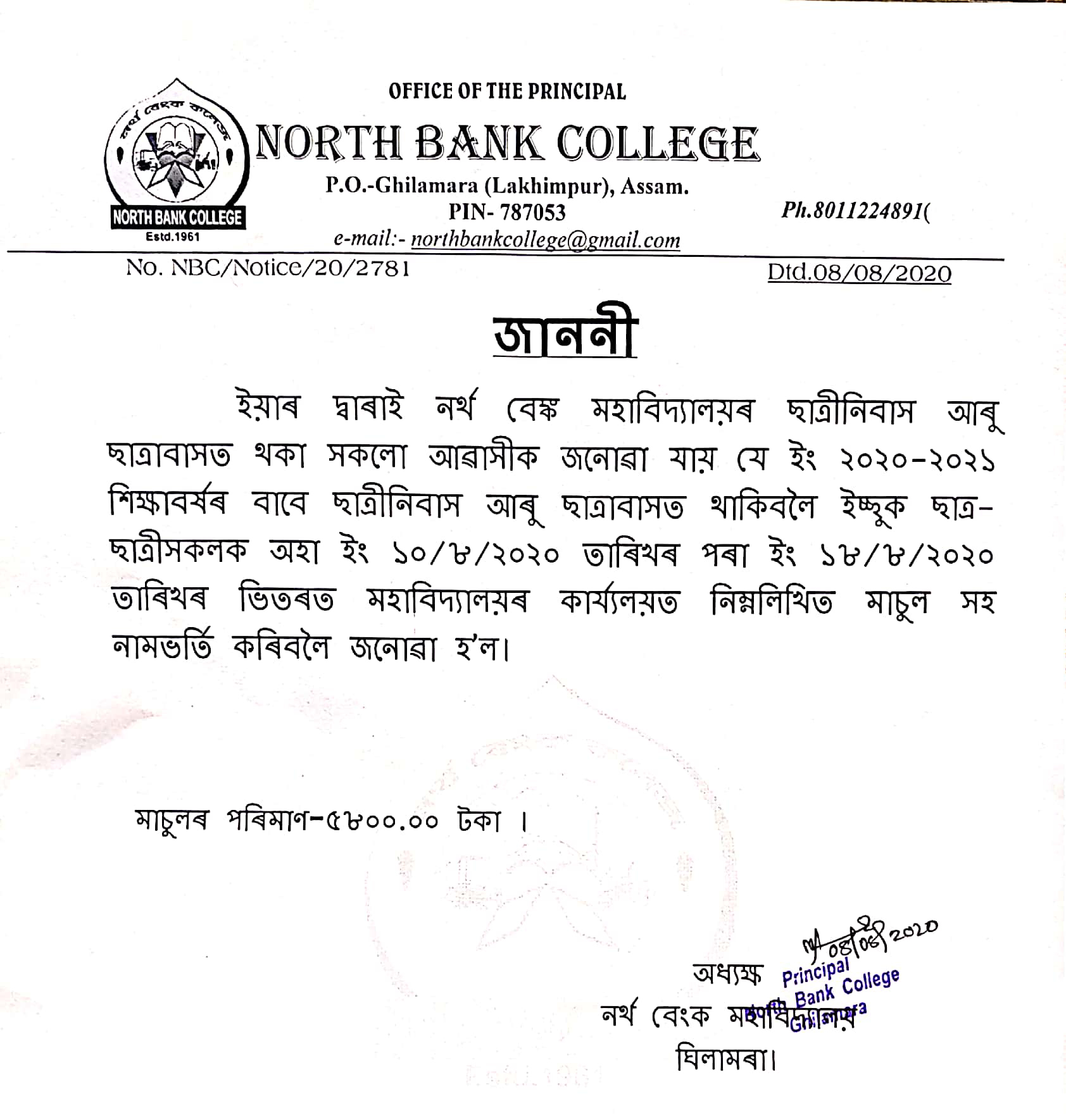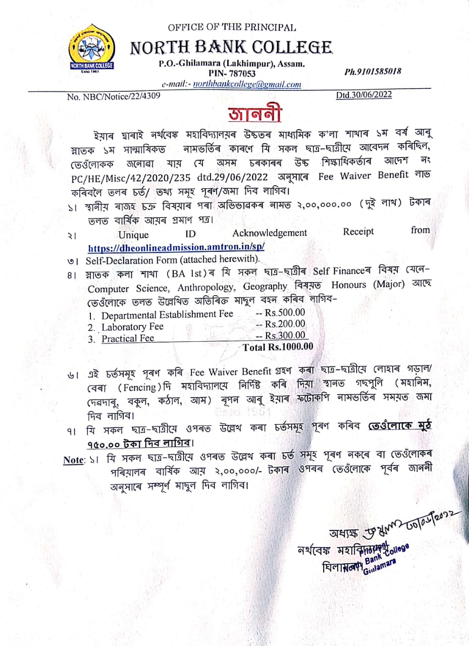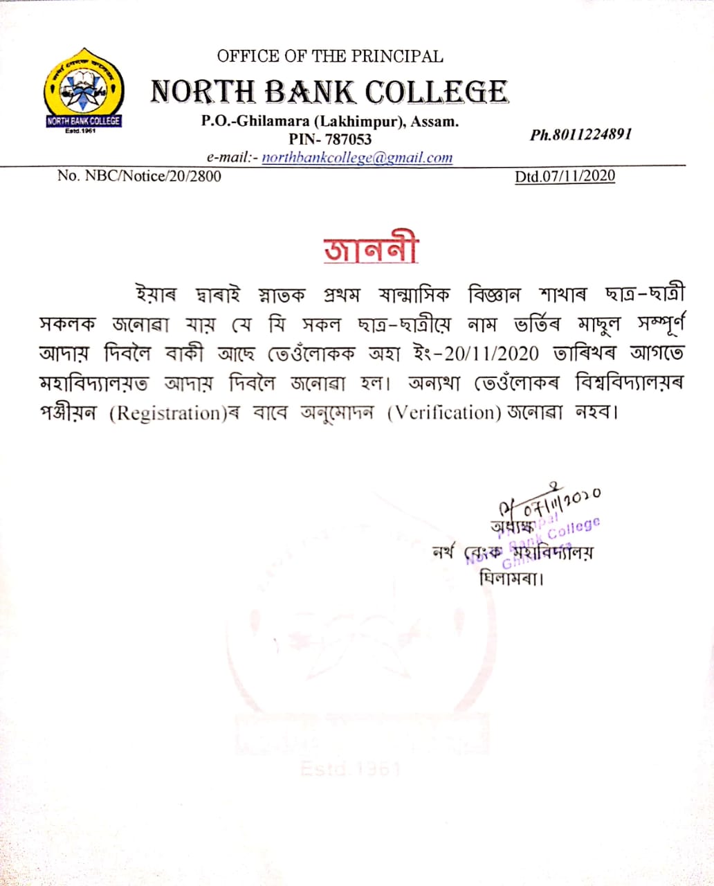 Notification for Complete of Admission Fee of B.Sc. 1st Sem.-2020