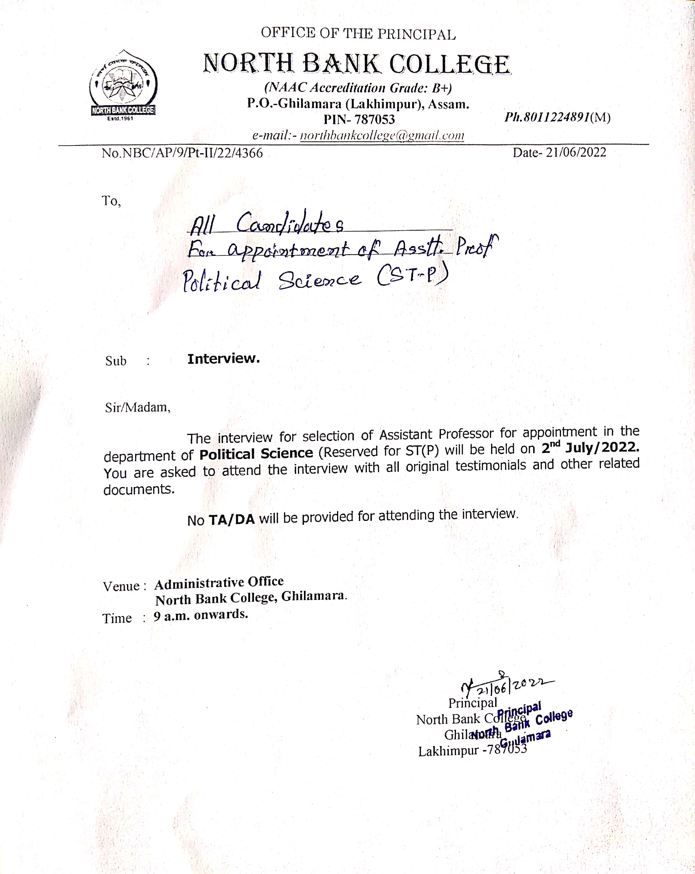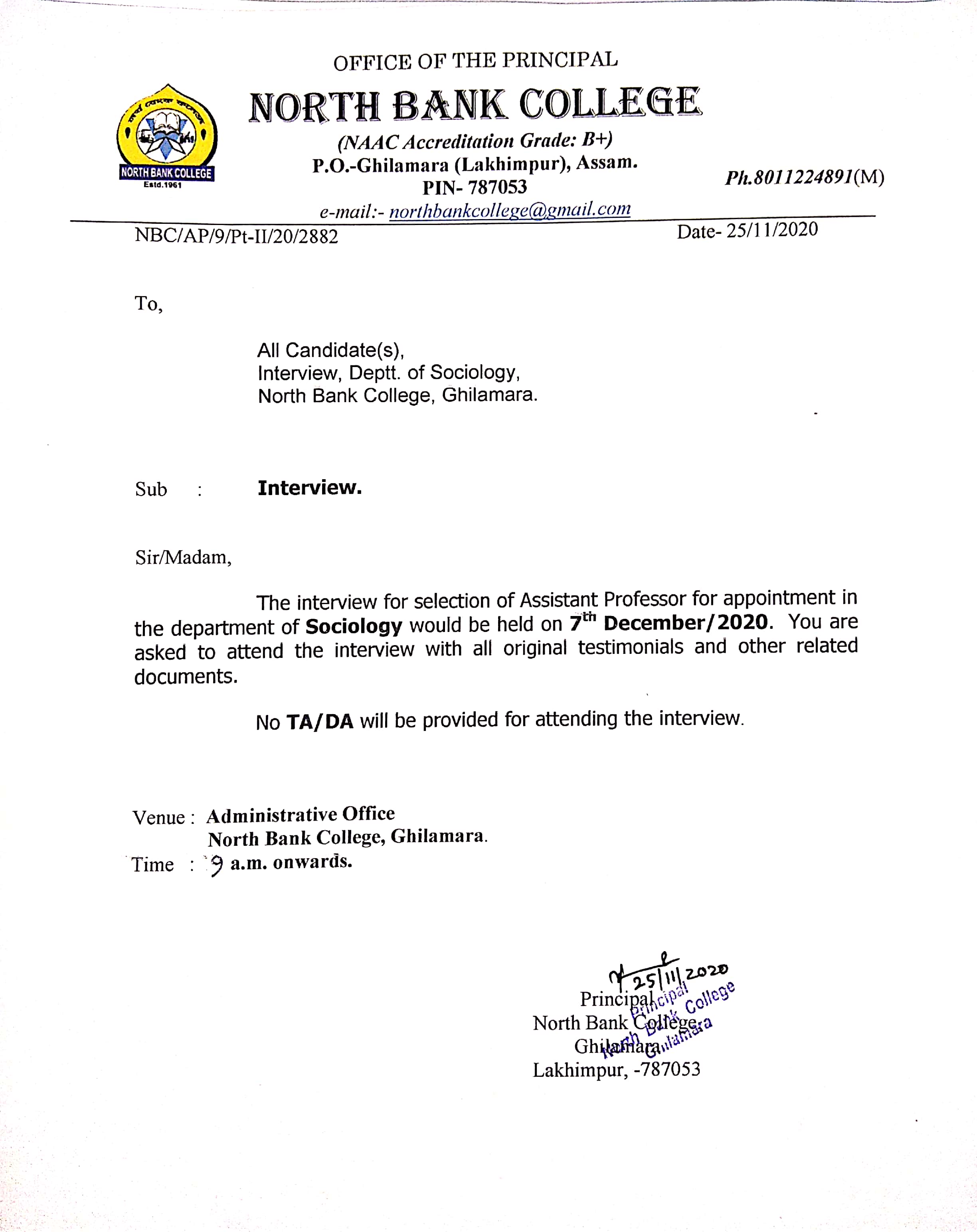 Call Letter to the Candidate(s) for Selection of Asstt. Prof, Interview, Sociology Deptt.