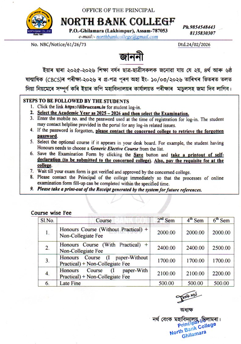 Exam Form Fill-Up of 2nd, 4th and 6th Sem (CBCS)-2026