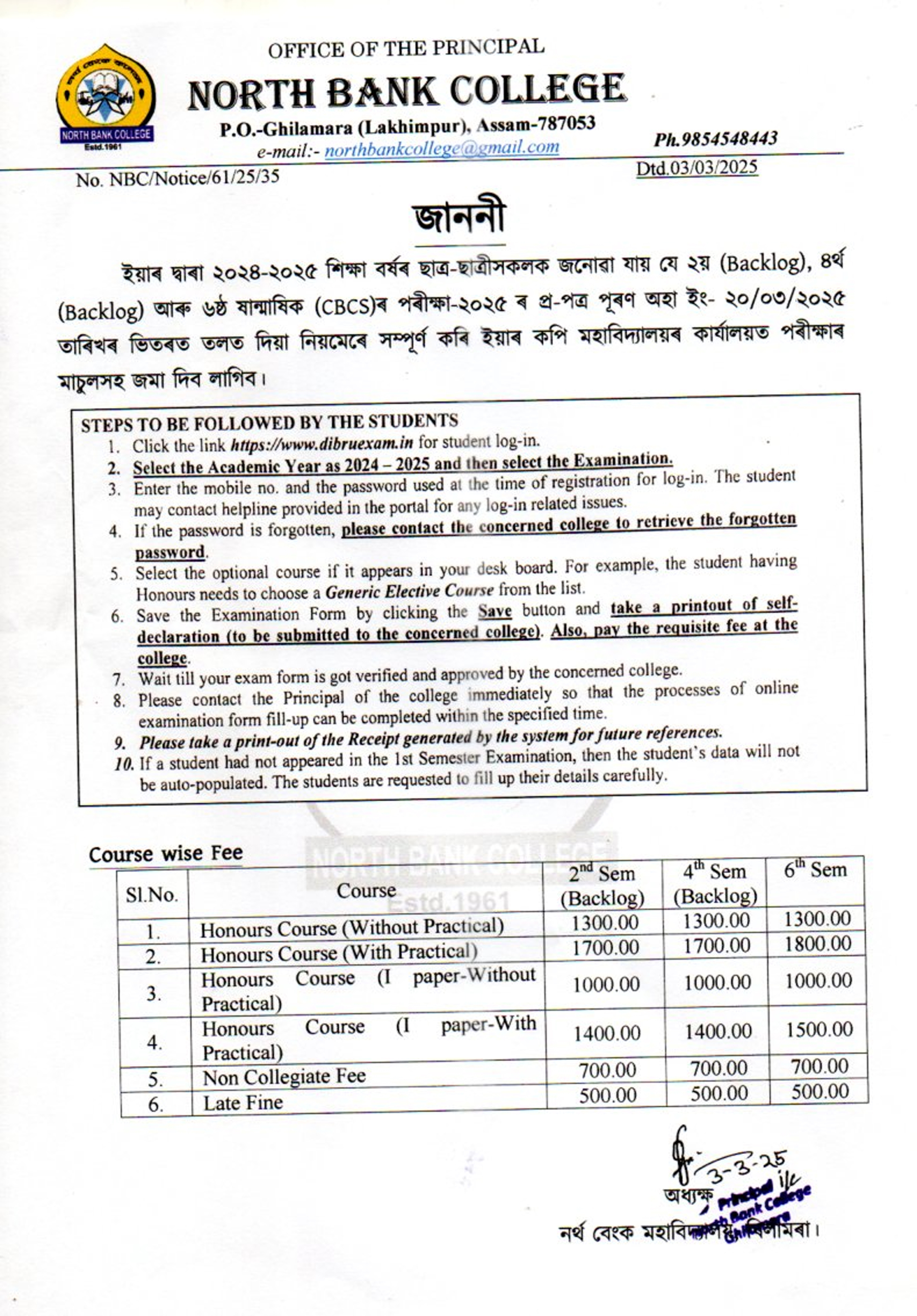 Notice for Exam For Fillup of 2nd, 4th (Backlog) and 6th Sem (CBCS) Examination-2025