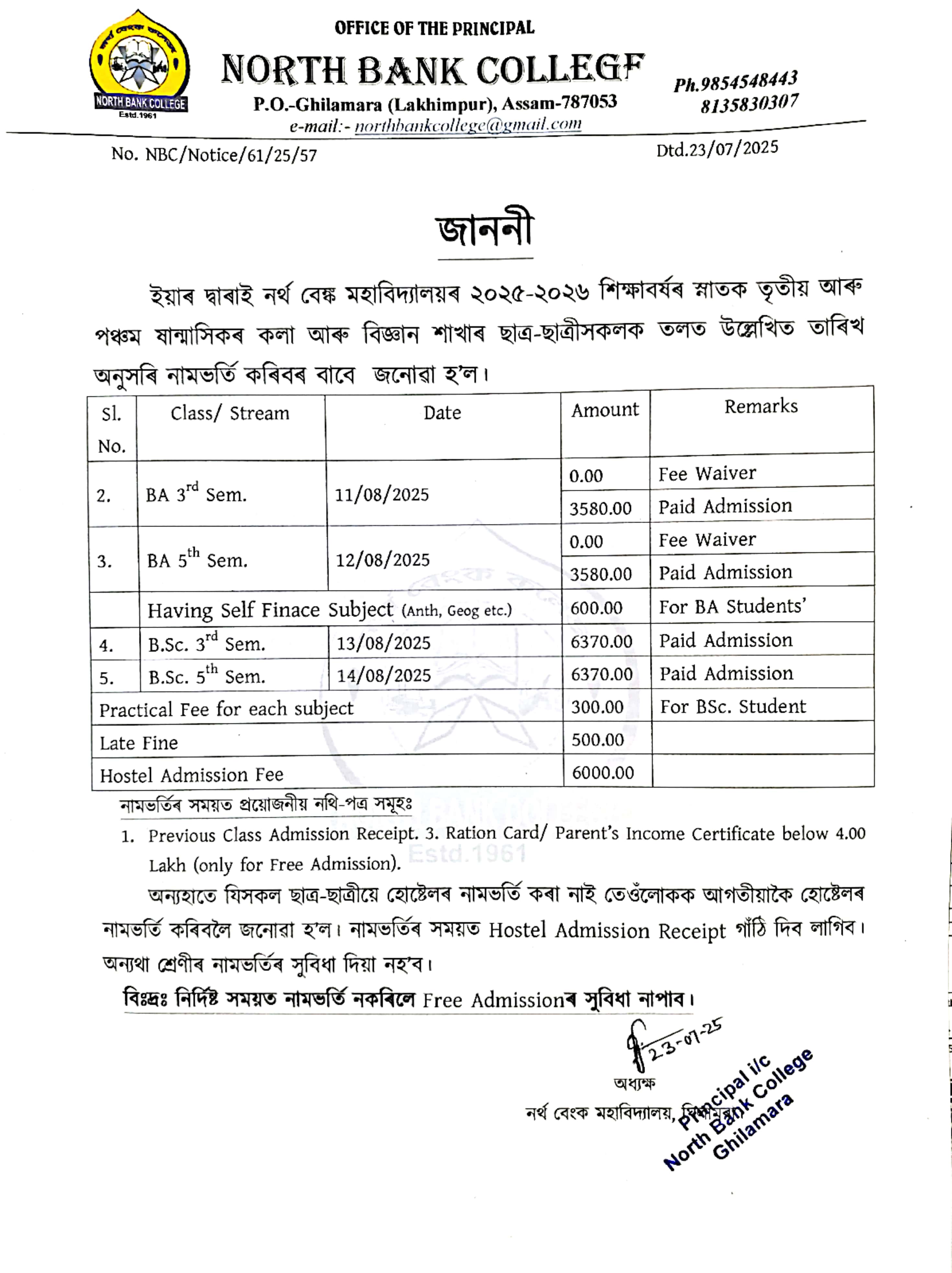 Admission Notice for BA & BSc 3rd Sem and 5th Sem-2025-26